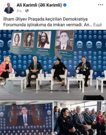 Əli Kərimov “Forum 2000” tədbiri ilə bağlı status paylaşıb. Statusda paylaşdığı şəkili isə foto montajla düzəldib, öz başını forumda çıxış edən prezidentin başının üstündə çox kor təbii şəkildə kəsərək yapışdırıb ki, “hörmətli” görsənsin. Hətta tədbirin açılışnda olan iştirakçıların şəklini paylaşıb ki, guya onun çıxışına həmin şəxslər baxıb, halbuki onun çıxışı zamanı həmin şəxslər orada olmayıb, yarı-boş zala “danışıb”. Danışmağı isə başqa saxtakarlıq nümunəsidir.