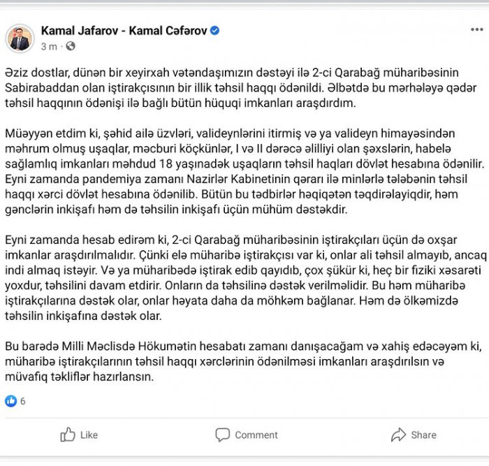 Bu barədə Milli Məclisdə Hökumətin hesabatı zamanı danışacağam və xahiş edəcəyəm ki, müharibə iştirakçılarının təhsil haqqı xərclərinin ödənilməsi imkanları araşdırılsın və müvafiq təkliflər hazırlansın.