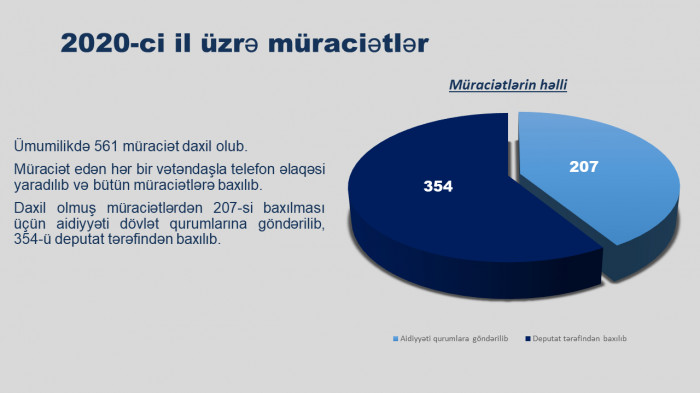 Daxil olmuş müraciətlərdən 207-si baxılması üçün aidiyyəti dövlət qurumlarına göndərilib, 354-ü deputat tərəfindən baxılıb.