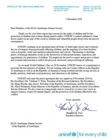 Eyni zamanda, Məktubda UNİCEF-in dövlət başçıları tərəfindən 9 noyabr tarixində imzalanan bəyanatı və müharibənin dayandırılmasını dəstəklədiyi, gənclərin sülh, insan hüquqlarına hörmət və uşaq hüquqlarının qorunması ilə bağlı fəaliyyətini yüksək qiymətləndirdiyi də qeyd olunmuşdur.